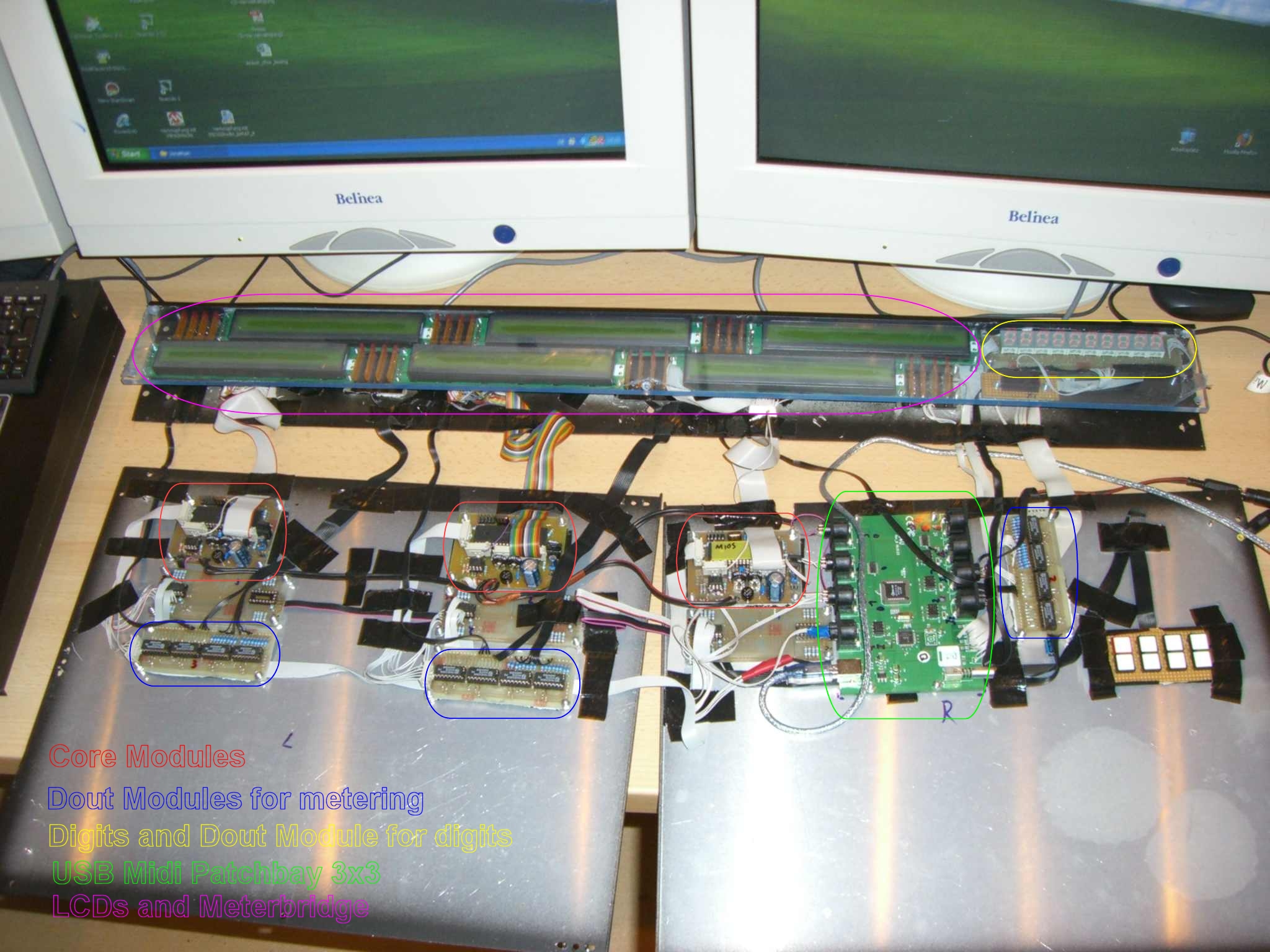 At next we go on with the “time code bar digits” and the metering. You can find the schematic under http://www.ucapps.de/midibox_lc.html in midibox_lc_leddigits.pdf and midibox_lc_ledrings_meters.pdf. Here you can find my board and my schematic that I’ve developed for the digits. The layout and description is under http://www.ucapps.de/mbhp_dout.html. For the time code bar and the metering we need the dout module which is connected to the core module. The time code bar is connected to the first core module. I programmed the software in a way that the dout module for the metering is first connected to the core module and the dout module for the time code bar is connected to the dout module of the metering. (see picture below).